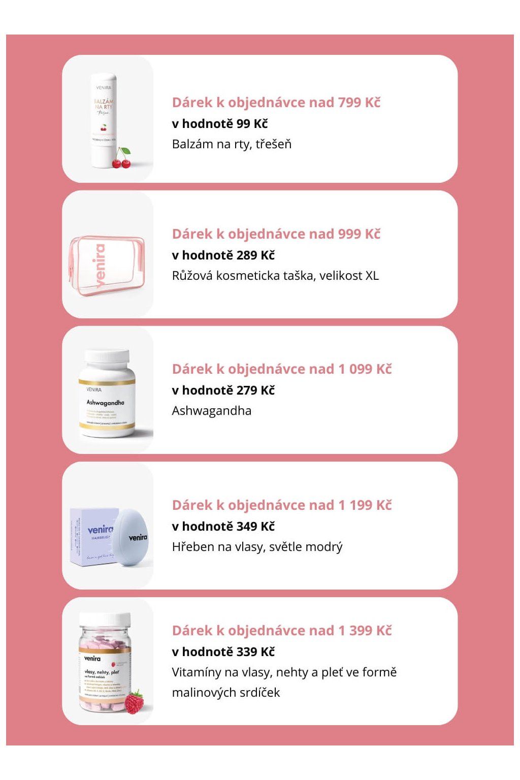 Dárků máme aktuálně 14 a jsou odstupňovány podle hodnoty objednávky. Zobrazí se automaticky v 1. kroku nákupního košíku, kde si podle hodnoty vaší objednávky vyberete ten dárek, který se vám bude nejvíc líbit.