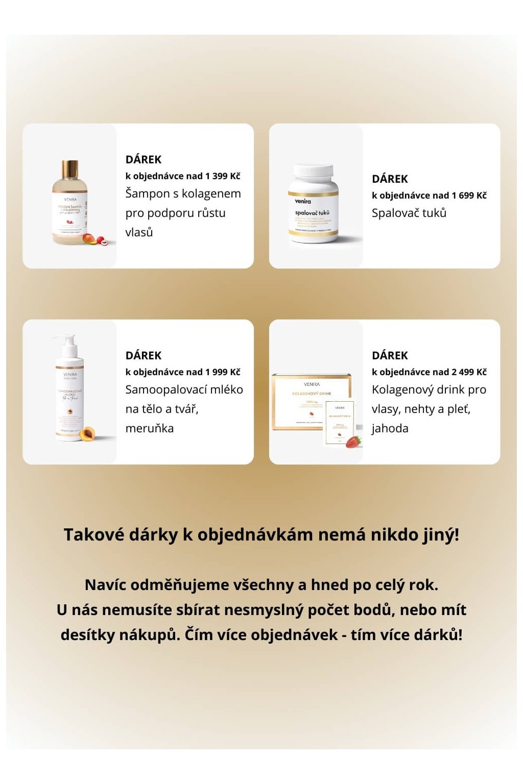 - obsahuje 100 mg hydrolyzovaného kolagenu a dalších 14 účinných látek v denní dávce (včetně kyseliny hyaluronové a biotinu)