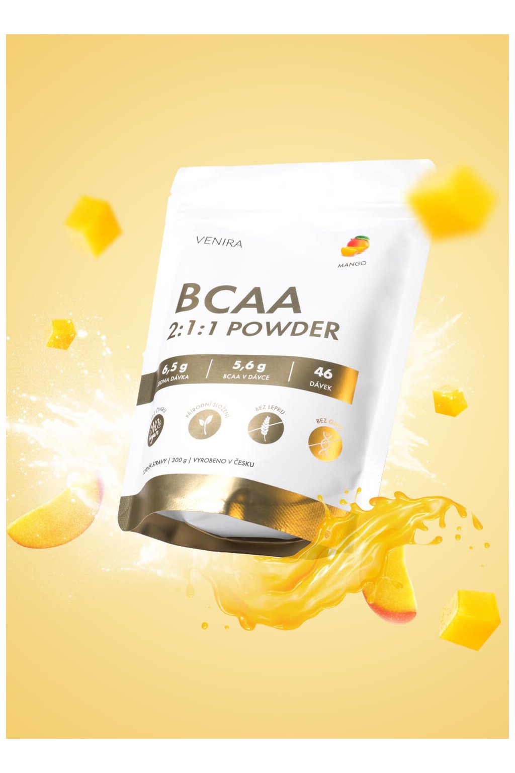 5000 mg BCAA, větvené aminokyseliny leucin, isoleucin a valin, napomáhají k regeneraci, vhodné i před a během tréninku.