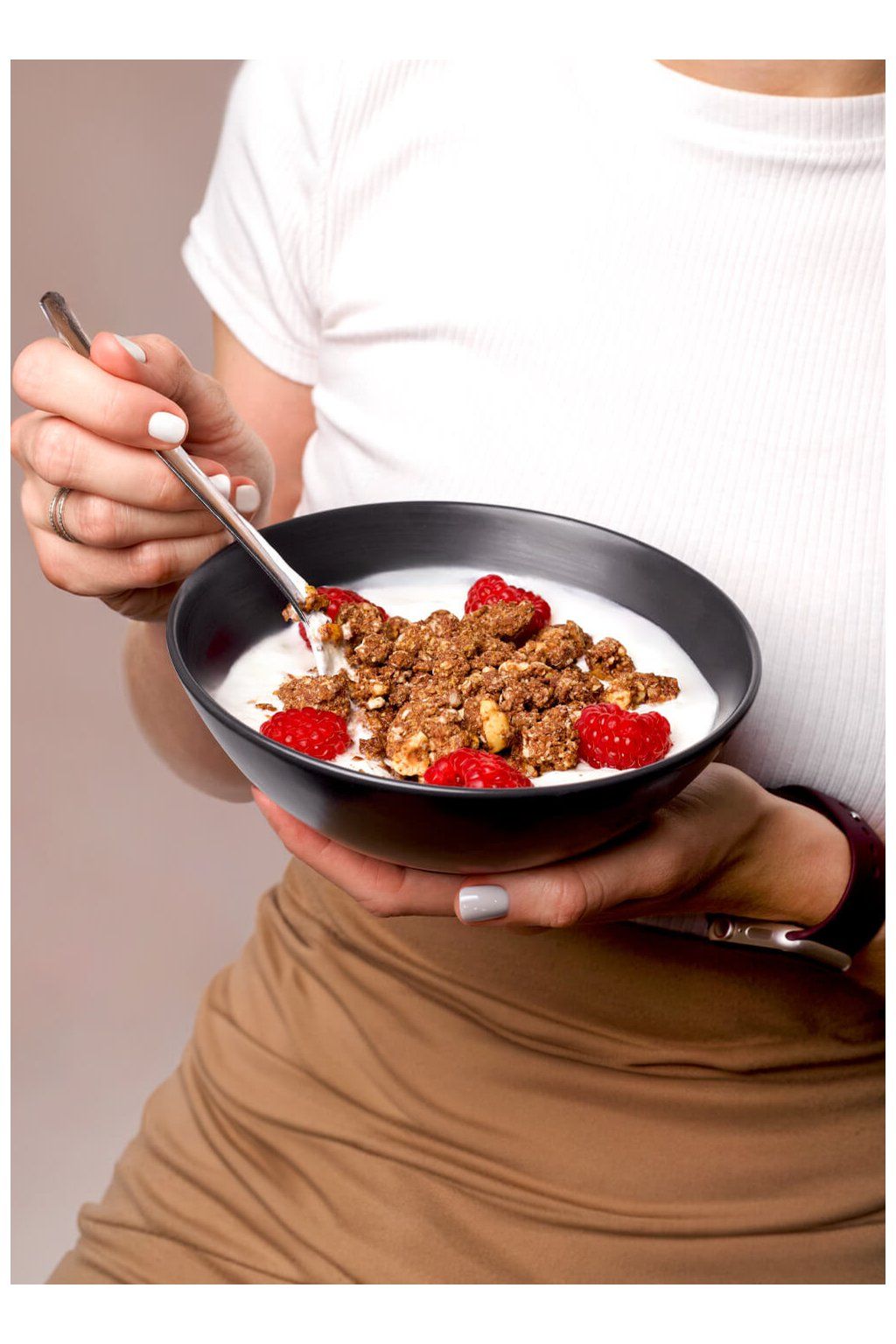 Granolu si můžeš vychutnat na nespočet způsobů – nejčastěji s mlékem nebo jogurtem a čerstvým ovocem, ale skvěle se hodí i jako křupavý topping na smoothie bowl či dezerty. Můžeš ji mít po ruce i samotnou jako rychlou a výživnou svačinu, když potřebuješ dodat energii kdykoliv během dne.