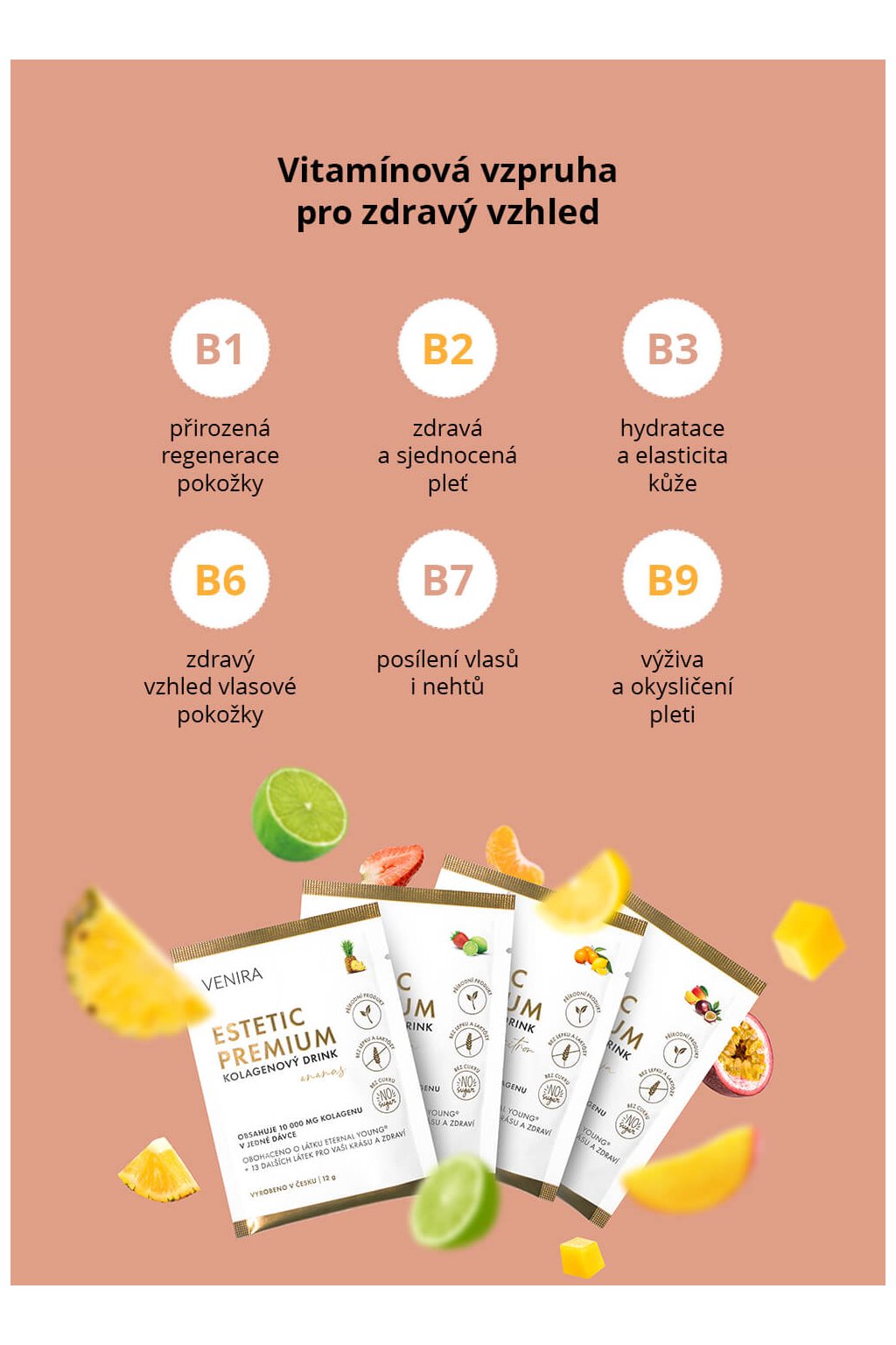 • revoluční prémiový kolagenový drink speciálně navržený pro krásu a přirozenou vitalitu pleti, vlasů i nehtů