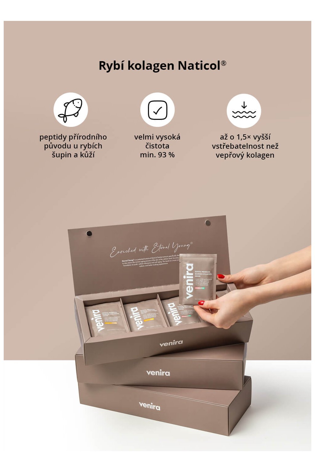 Prémiový hydrolyzovaný mořský kolagen Naticol® pochází z prvotřídních rybích kůží z evropských certifikovaných chovů. Jeho minimální velikost částic zajišťuje rychlé vstřebávání bez zátěže pro organismus. Navzdory svému rybímu původu je chuťově zcela neutrální. Pravidelným užíváním přispívá ke zpevnění pokožky, redukci jemných vrásek, zlepšení elasticity i podpoře zdraví kloubů a svalů.
