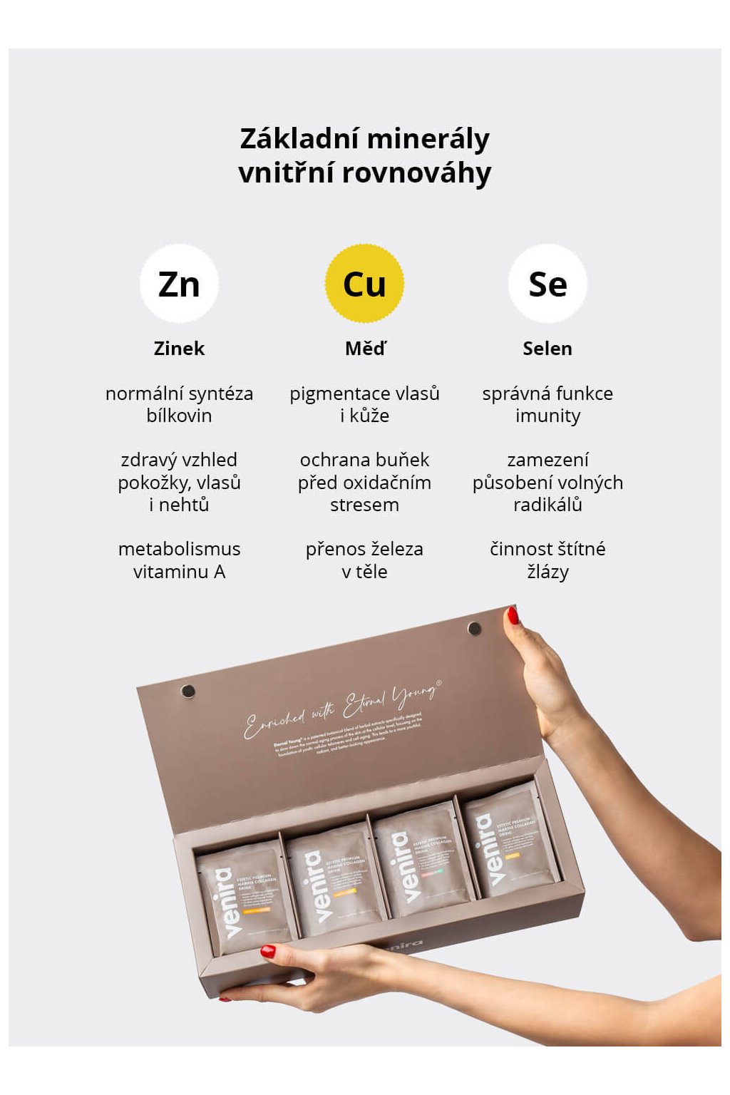 Tři klíčové minerály – zinek, měď (v chelátové formě) a selen – tvoří základní oporu pro vitalitu těla i krásu navenek. Zatímco chelátové formy zajišťují vysokou vstřebatelnost a účinnost, selen doplňuje tuto trojici svou antioxidační silou. Společně podporují tvorbu kolagenu, chrání buňky před oxidačním stresem, udržují zdravý tón pokožky a vlasů a přispívají k rovnováze imunitního i nervového systému.