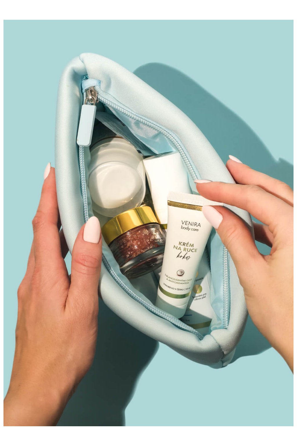 Kosmetická taška je vyrobena z kombinace neoprenu, polyesteru a nylonu - tří materiálů, které spojují odolnost, lehkost a dlouhou životnost. Neopren dodává taštičce pružnost a pevnost, díky nimž bez problému zvládne každodenní používání a zachová si tak stále svůj tvar. Navíc je voděodolná, takže přirozeně odpuzuje vlhkost i kapky vody tak, aby kosmetika uvnitř zůstala vždy chráněná. Polyester jí propůjčuje lehkost, zatímco nylon posiluje švy a přispívá k celkové stabilitě konstrukce.