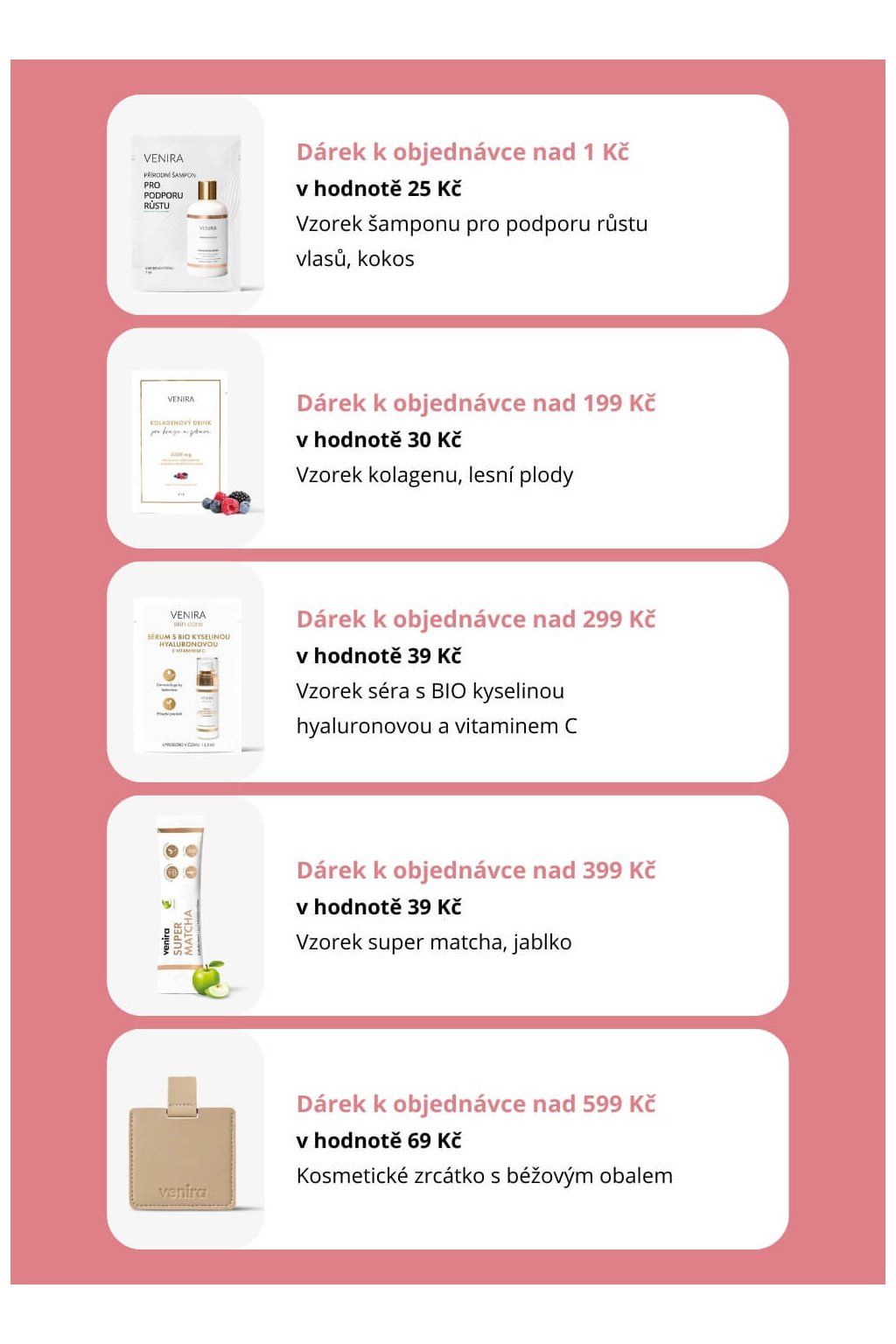 Dárků máme aktuálně 14 a jsou odstupňovány podle hodnoty objednávky. Zobrazí se automaticky v 1. kroku nákupního košíku, kde si podle hodnoty vaší objednávky vyberete ten dárek, který se vám bude nejvíc líbit.