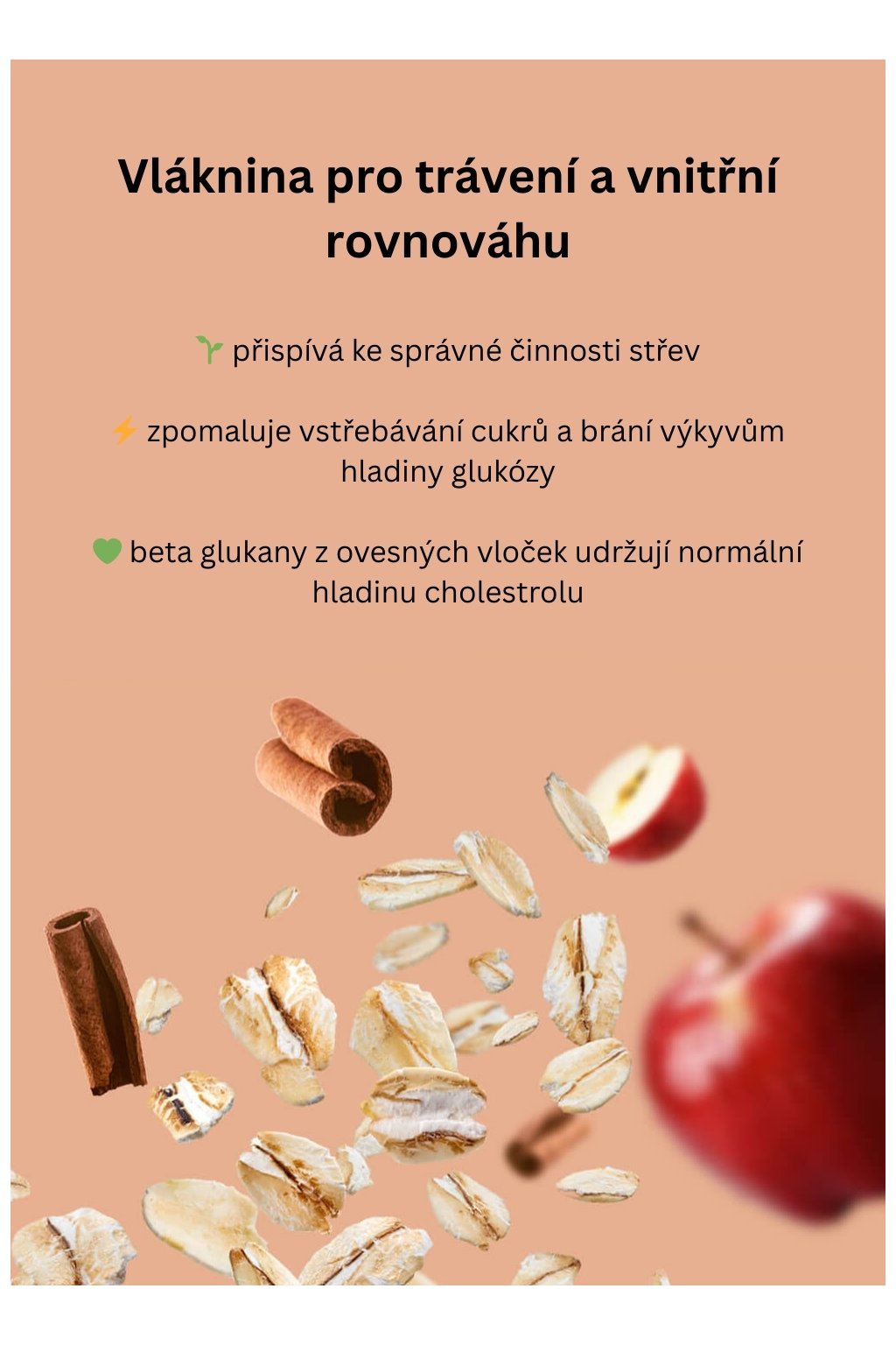 Ovesná kaše je zdrojem přírodní vlákniny, která je pro tělo naprosto nepostradatelná. Vláknina podporuje zdravou činnost střev a pravidelnost stolice, pomáhá předcházet nepříjemným zažívacím potížím a přispívá k udržení optimální střevní mikroflóry, která má vliv na imunitu i celkovou pohodu. Díky obsahu rozpustné vlákniny (beta glukanů) z ovesných vloček navíc pomáhá udržovat normální hladinu cholesterolu v krvi.
