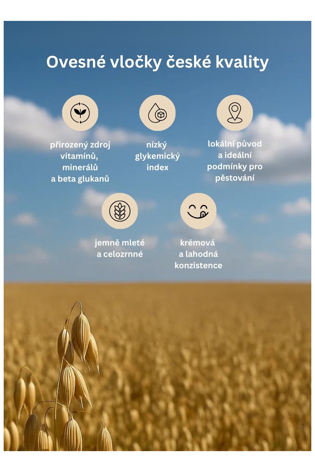 Základem kaše jsou jemně mleté, celozrnné a bezlepkové ovesné vločky, které vynikají svou kvalitou a původem. Díky ideálním podmínkám pěstování v České republice si zachovávají vysoký obsah beta glukanů, vitamínů i minerálů. Navíc mají nízký glykemický index, což znamená, že zajišťují postupné uvolňování energie bez výkyvů hladiny cukru v krvi. Díky své jemné struktuře snadno absorbují vodu i mléko a vytváří krémovou konzistenci, která je základem lahodné snídaně.
