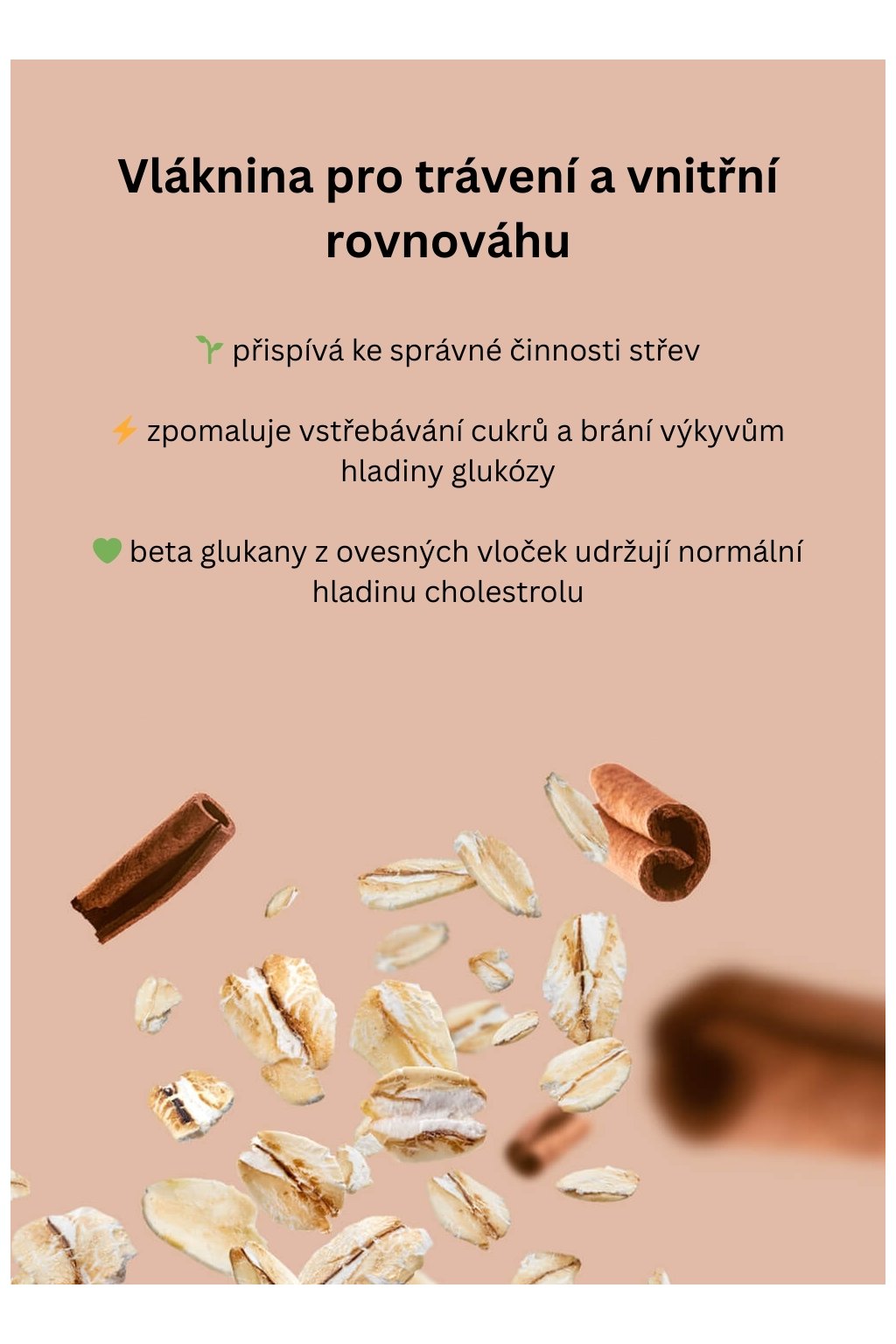 Ovesná kaše je zdrojem přírodní vlákniny, která je pro tělo naprosto nepostradatelná. Vláknina podporuje zdravou činnost střev a pravidelnost stolice, pomáhá předcházet nepříjemným zažívacím potížím a přispívá k udržení optimální střevní mikroflóry, která má vliv na imunitu i celkovou pohodu. Díky obsahu rozpustné vlákniny (beta glukanů) z ovesných vloček navíc pomáhá udržovat normální hladinu cholesterolu v krvi.