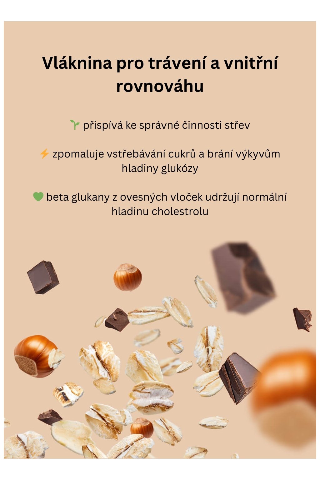 Ovesná kaše je zdrojem přírodní vlákniny, která je pro tělo naprosto nepostradatelná. Vláknina podporuje zdravou činnost střev a pravidelnost stolice, pomáhá předcházet nepříjemným zažívacím potížím a přispívá k udržení optimální střevní mikroflóry, která má vliv na imunitu i celkovou pohodu. Díky obsahu rozpustné vlákniny (beta glukanů) z ovesných vloček navíc pomáhá udržovat normální hladinu cholesterolu v krvi.