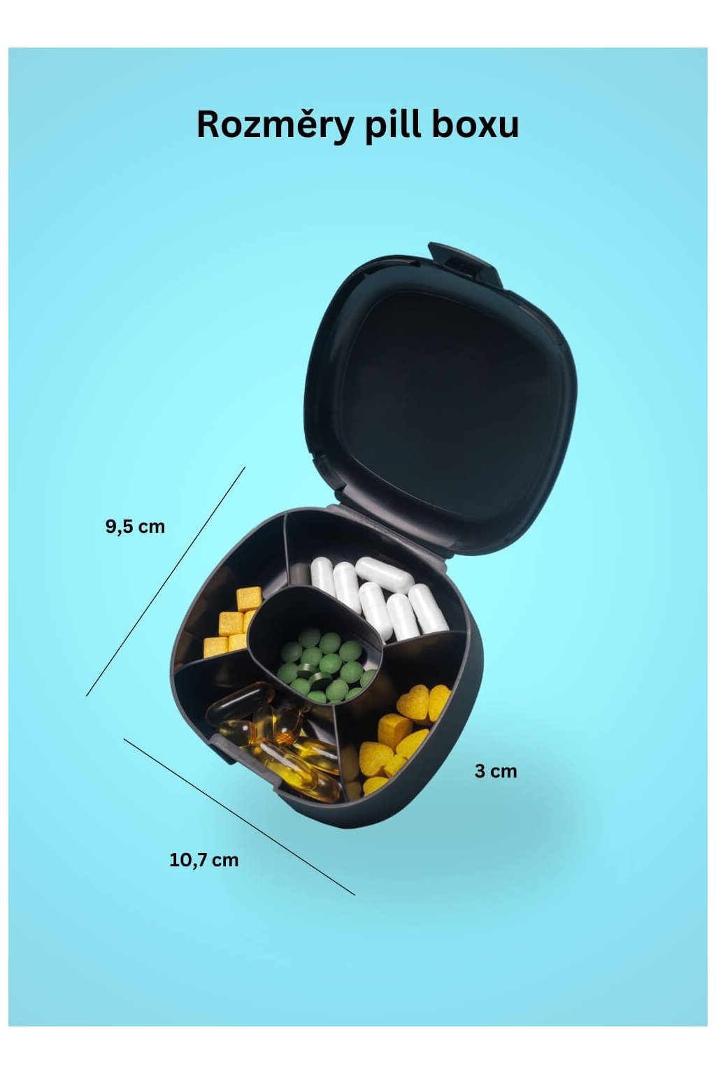 Díky 5 samostatným přihrádkám si můžeš dopředu naplánovat užívání doplňků stravy nebo léků a mít tak jistotu, že máš vše dokonale pod kontrolou až na pět dní dopředu. Zapomeň na zmatečné hledání kapslí v krabičkách – s tímto praktickým organizérem máš vše pod kontrolou a navíc se nemusíš bát, že bys vynechal svou denní dávku. Každá přihrádka je chráněna spolehlivým zaklapávacím uzávěrem, který pevně drží a brání vysypání tablet, a to i v případě, že pill box přenášíš v kabelce nebo batohu.