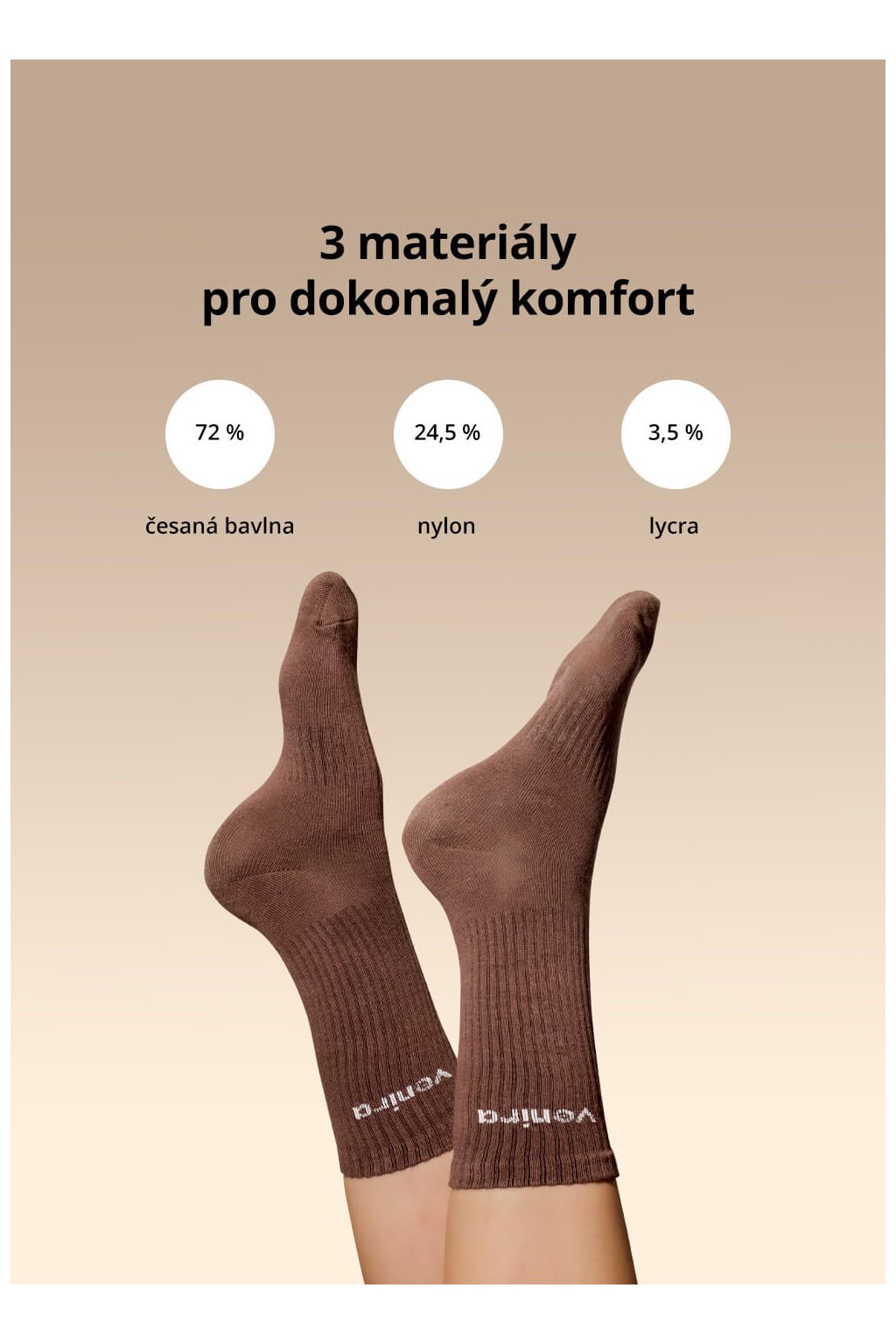 Horní část ponožek je žebrovaná, což zajišťuje, že skvěle drží na svém místě bez nepříjemného stahování nebo zařezávání. Celkový vzhled podtrhuje decentní a elegantní logo VENIRA, které jim dodává šmrnc. Ponožky jsou navíc díky třem dostupným velikostem navrženy tak, aby perfektně seděly na každé noze a zvládly nejen běžné nošení, ale i aktivní odpoledne ve fitku.