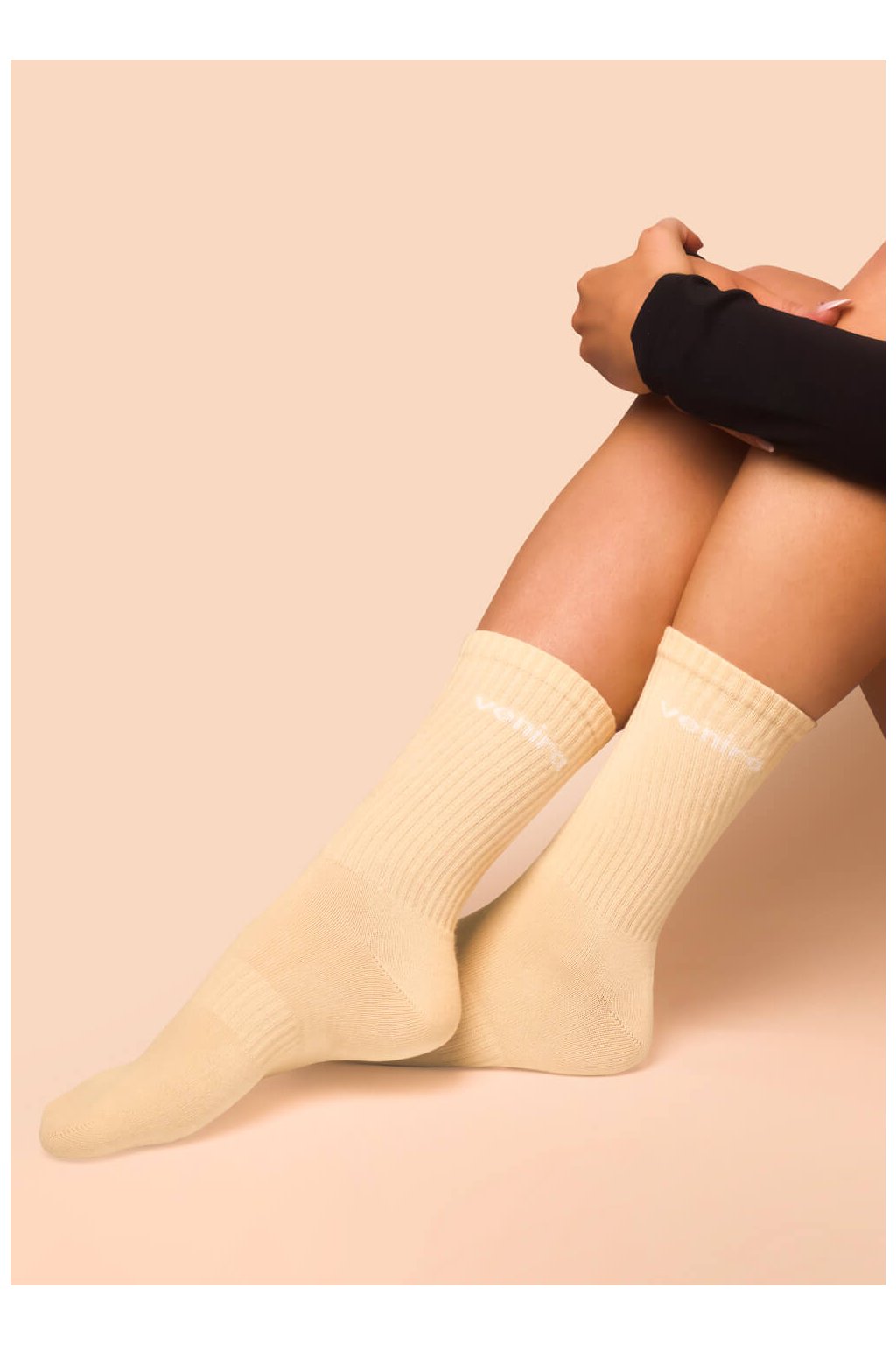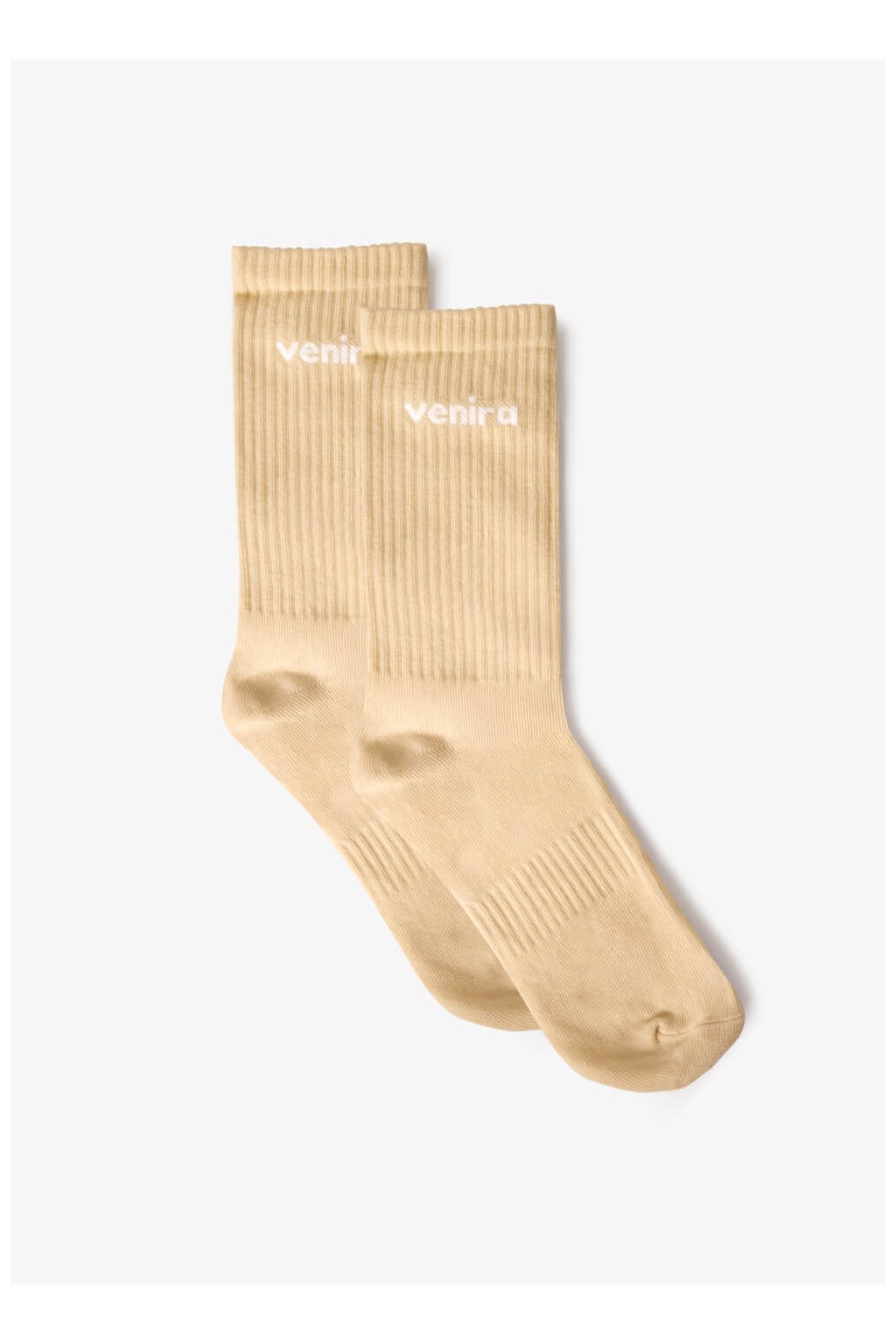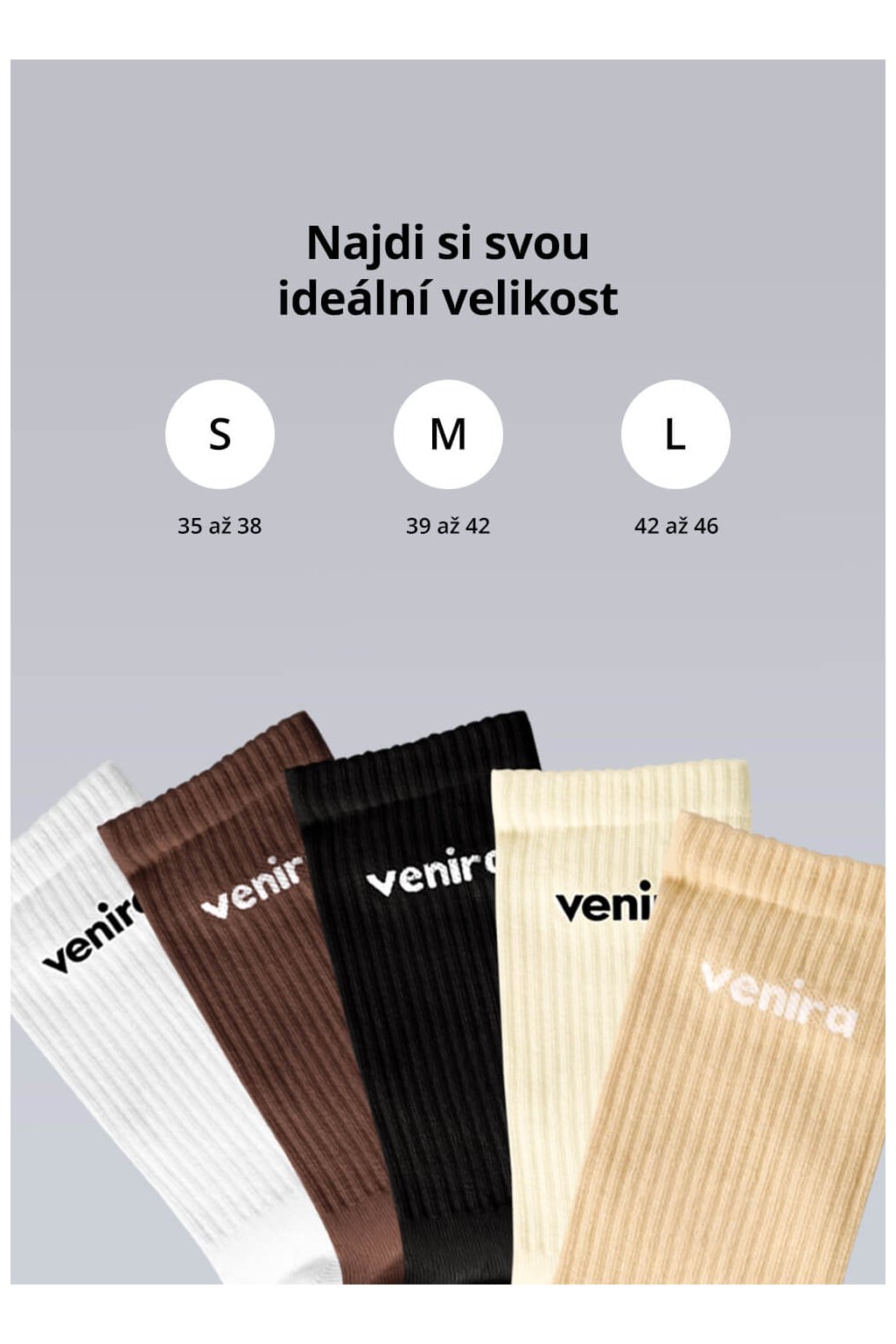 Horní část ponožek je žebrovaná, což zajišťuje, že skvěle drží na svém místě bez nepříjemného stahování nebo zařezávání. Celkový vzhled podtrhuje decentní a elegantní logo VENIRA, které jim dodává šmrnc. Ponožky jsou navíc díky třem dostupným velikostem navrženy tak, aby perfektně seděly na každé noze a zvládly nejen běžné nošení, ale i aktivní odpoledne ve fitku.