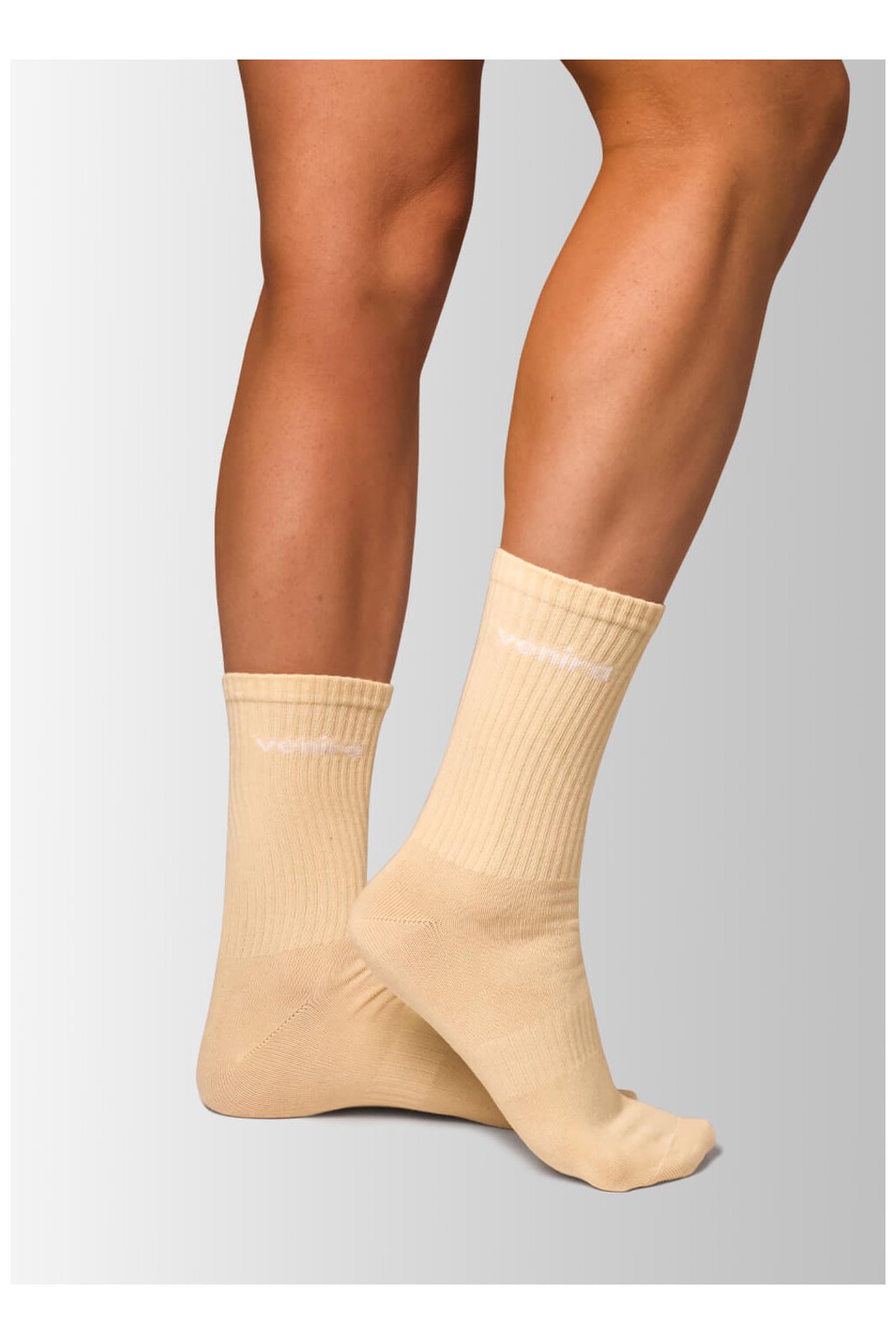 Horní část ponožek je žebrovaná, což zajišťuje, že skvěle drží na svém místě bez nepříjemného stahování nebo zařezávání. Celkový vzhled podtrhuje decentní a elegantní logo VENIRA, které jim dodává šmrnc. Ponožky jsou navíc díky třem dostupným velikostem navrženy tak, aby perfektně seděly na každé noze a zvládly nejen běžné nošení, ale i aktivní odpoledne ve fitku.