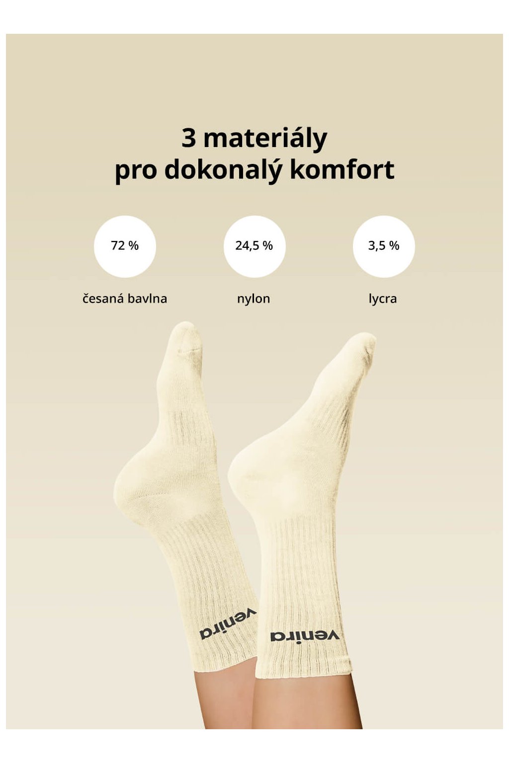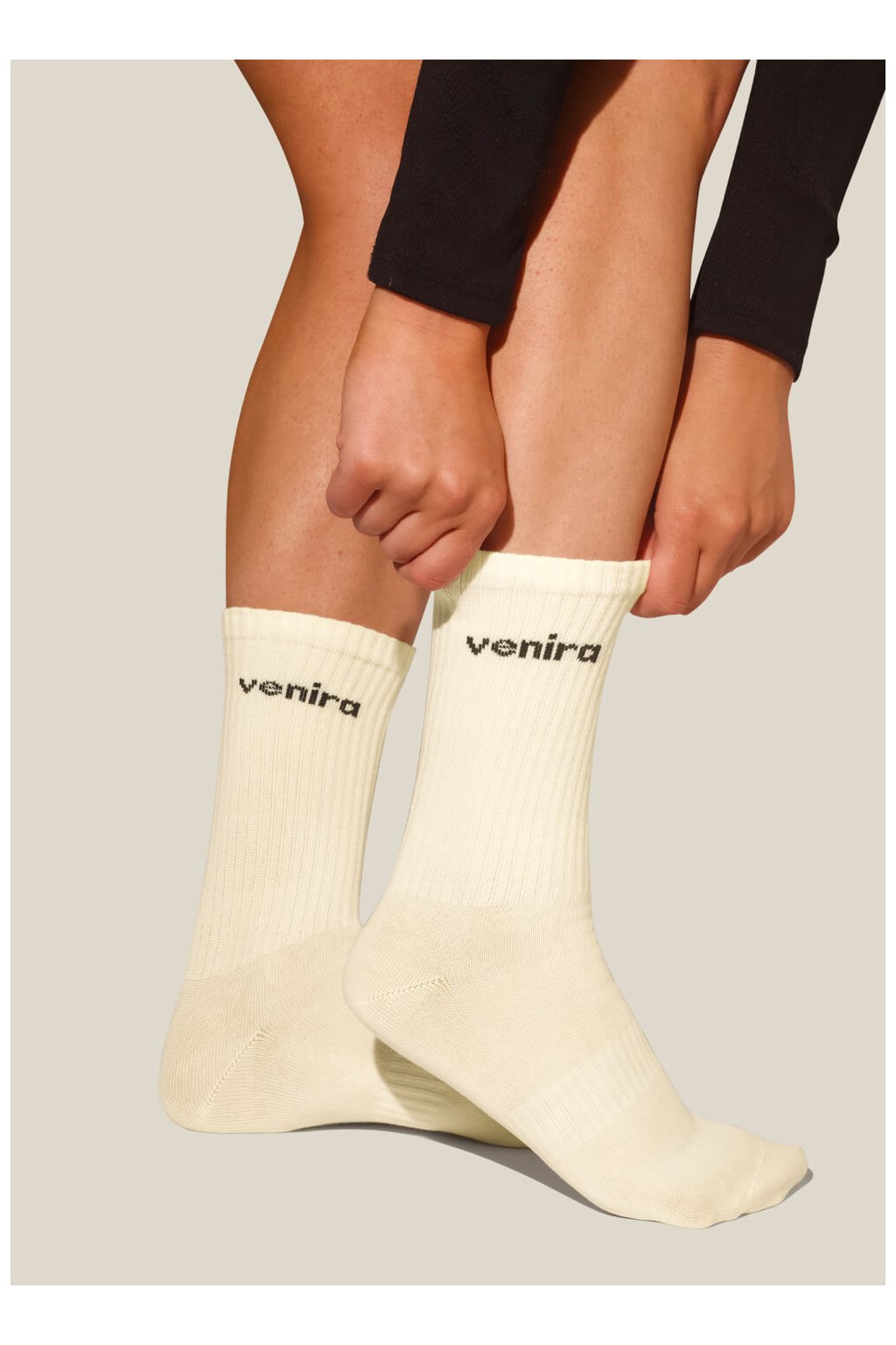 Horní část ponožek je žebrovaná, což zajišťuje, že skvěle drží na svém místě bez nepříjemného stahování nebo zařezávání. Celkový vzhled podtrhuje decentní a elegantní logo VENIRA, které jim dodává šmrnc. Ponožky jsou navíc díky třem dostupným velikostem navrženy tak, aby perfektně seděly na každé noze a zvládly nejen běžné nošení, ale i aktivní odpoledne ve fitku.