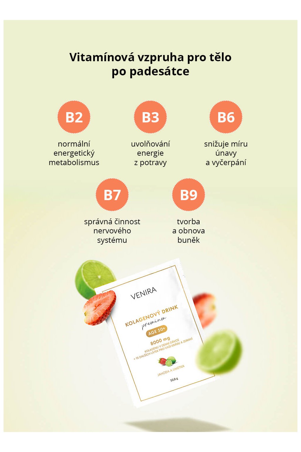 S přibývajícím věkem, zejména po padesátce, dochází ke zpomalení metabolických procesů v těle. Právě proto je důležité zaměřit se na pravidelné doplňování klíčových mikronutrientů. Kolagen je proto obohacen o 5 klíčových vitamínů skupiny B, které kromě podpory zdraví pokožky, vlasů a nehtů hrají zásadní roli při přeměně živin na energii.