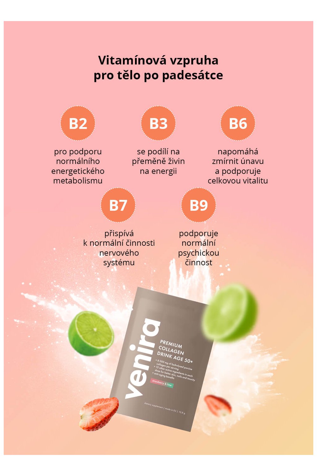 S přibývajícím věkem, zejména po padesátce, se přirozeně mění i metabolické procesy v těle. Proto je důležité pravidelně doplňovat klíčové mikronutrienty. Tento kolagen je obohacen o 5 vitamínů skupiny B, které přispívají k normálnímu energetickému metabolismu a ke snížení míry únavy a vyčerpání. Biotin a riboflavin zároveň napomáhají udržení normálního stavu pokožky, vlasů a sliznic, takže skvěle zapadají do každodenní beauty rutiny.