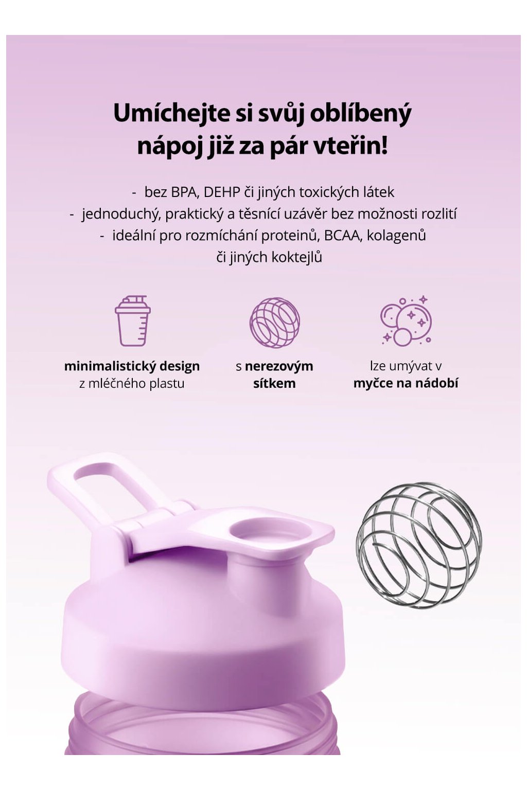 ## Bez BPA, DEHP či jiných toxických látek, perfektně těsnící uzávěr, pohodlné uchopení. ## ideální pro rozmíchání proteinů, BCAA, kolagenů či jiných koktejlů moderní a...