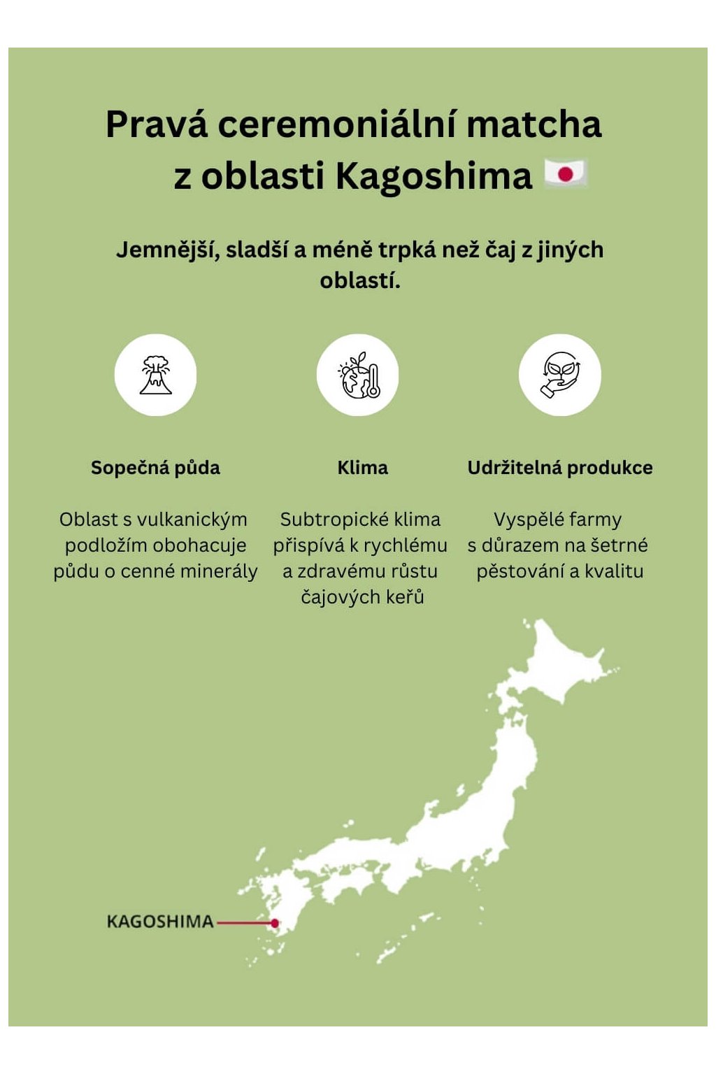 Naše matcha pochází z oblasti Kagoshima na jihu Japonska, která je proslulá svými úrodnými vulkanickými půdami a čistým prostředím. Díky pěstování v zastíněných zahradách si mladé čajové lístky uchovávají mimořádně vysoký obsah chlorofylu i cenných antioxidantů. Právě proto má matcha prášek svou typicky světle zelenou barvu, jemně nasládlou chuť s  harmonickou kombinací čerstvosti a umami tónů.