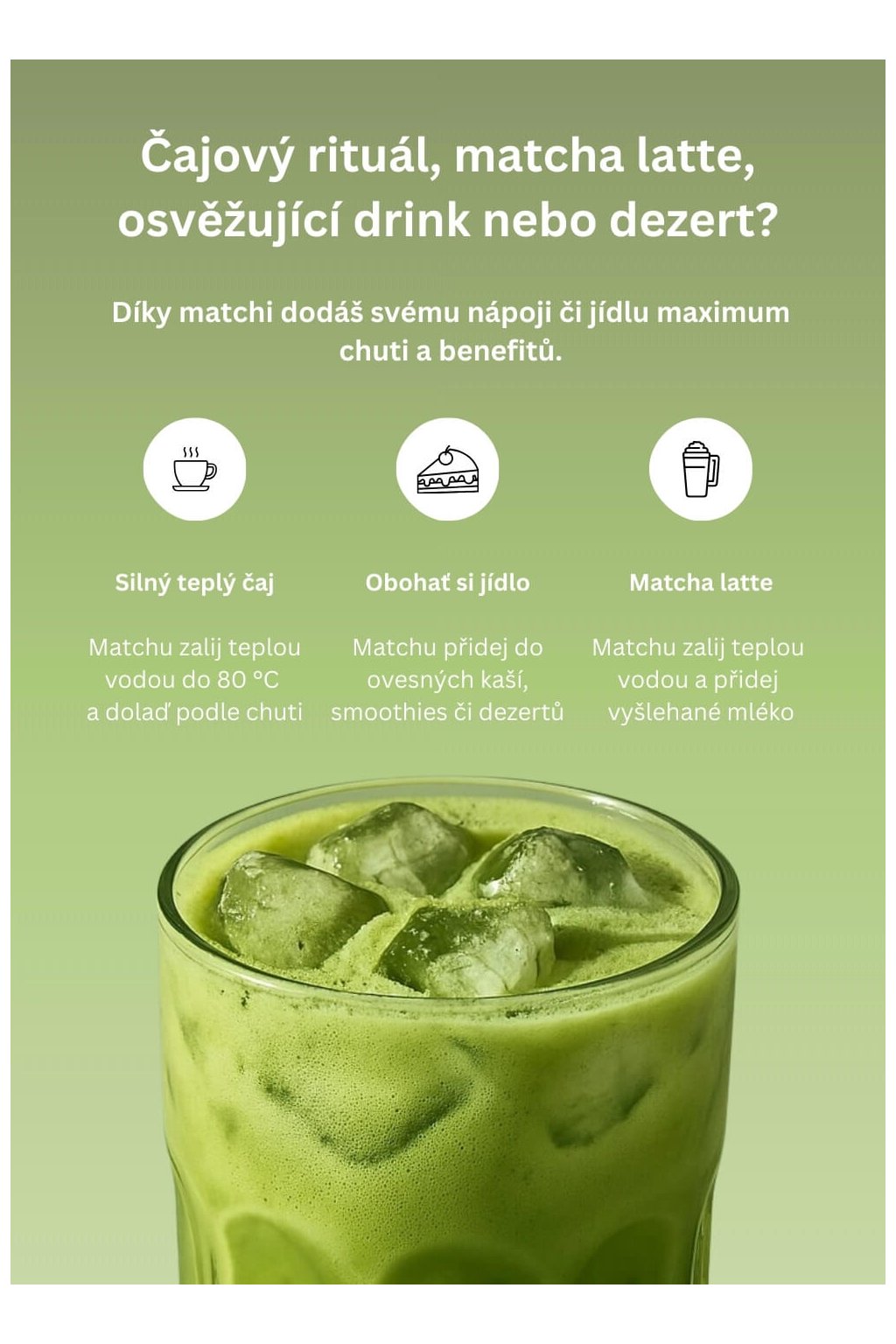 K dokonalému zážitku z matcha čaje patří i jeho příprava. Pro klasický čajový rituál stačí nasypat lžičku matcha prášku do sklenice, zalít vodou o teplotě 80 °C a důkladně vyšlehat, dokud nevznikne jemná pěna.
